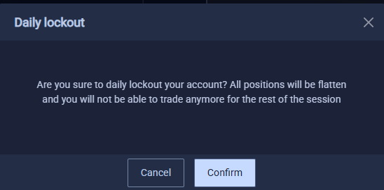 The Daily Lockout feature allows you to stop trading for the rest of the session. When activated, all open positions will be closed, and you will not be able to trade again until the next session.