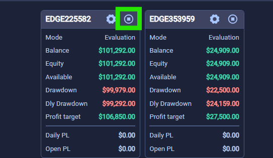 Path: Start Trading > Volumetrica > Accounts > Choose Account and select the Stop Button next to the gear ⚙️